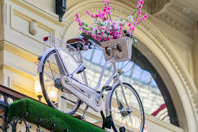Москва, Россия - 13 февраля 2018 г.: вид снизу на припаркованный белый велосипед с цветами в корзине, украшение центрального торгового центра ГУМ
