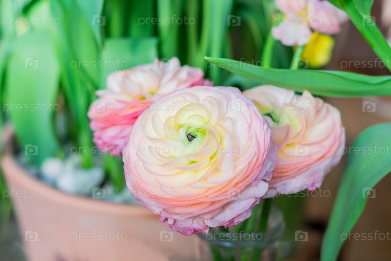 Крупный план пастельных розовых цветов лютика в прозрачной стеклянной вазе на зеленом фоне
