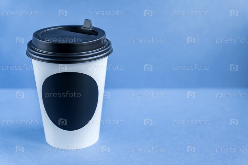 Белая бумажная крафтовая одноразовая чашка для кофе с черной пластиковой крышкой. кофе, чтобы пойти на синем фоне