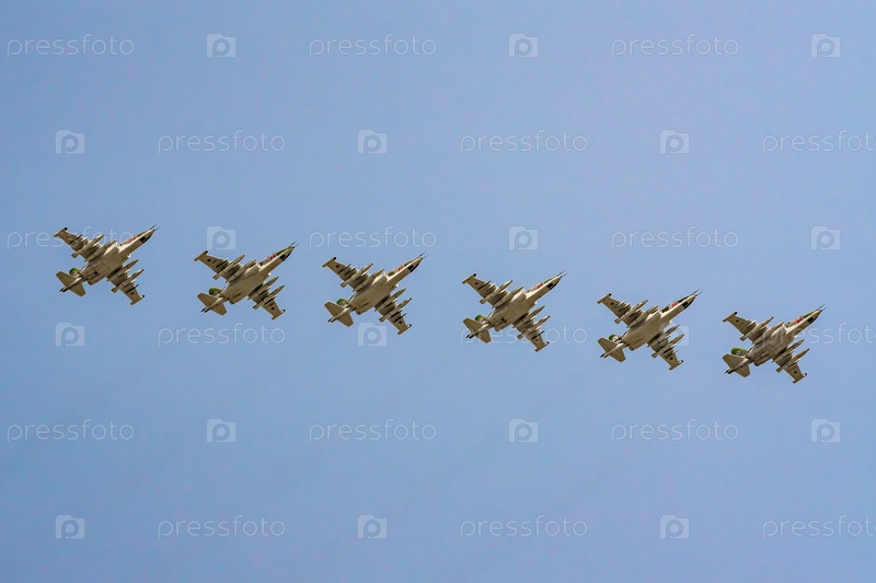 Москва, Россия - 04 мая 2018 г.: Самолет Су-25 ВВС России во время репетиции Парада Победы
