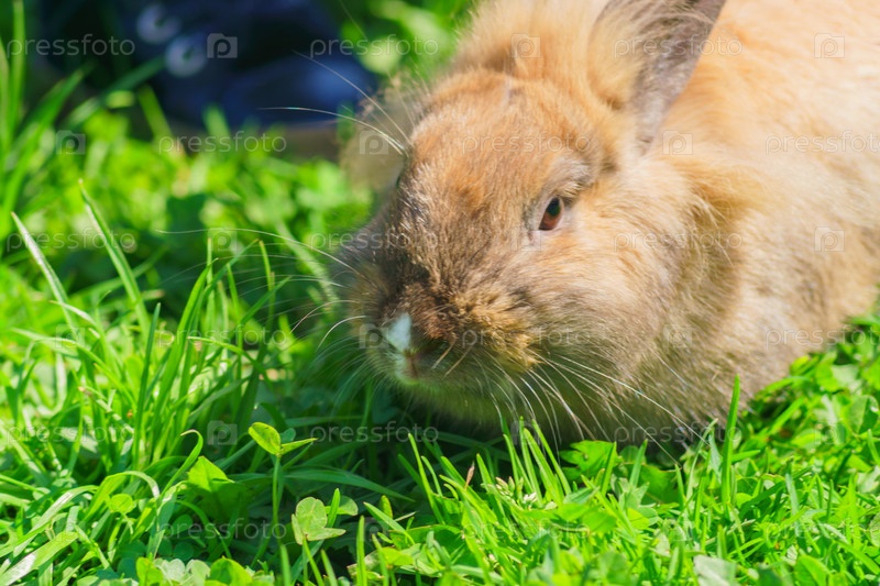 Портрет кролика с длинными ушами, сидящего на зеленой траве в саду
