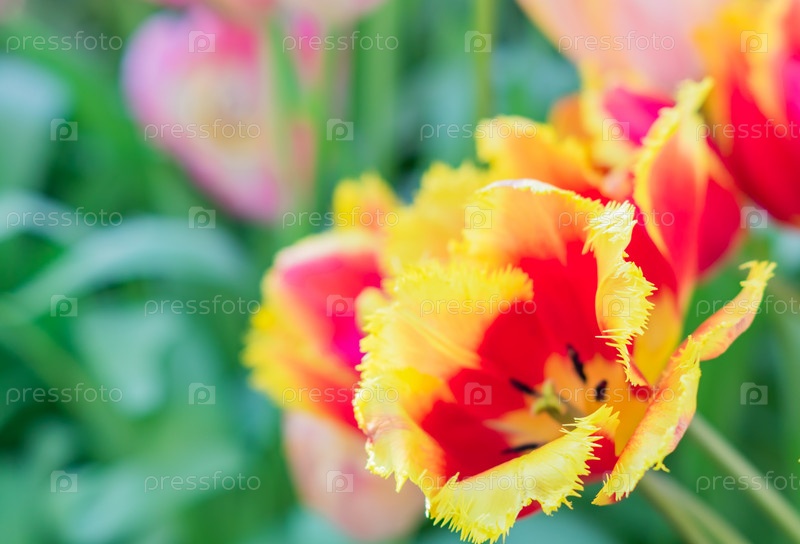 Большой план красивого цветущего тюльпана Канарский красный и желтый