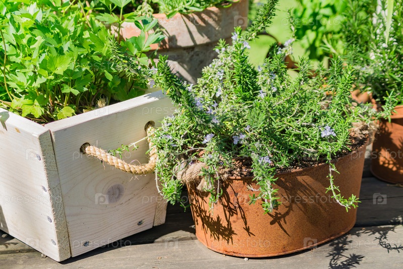 Зеленая трава и травы в деревянных ящиках и ржавых железных цветочных горшках на открытом воздухе. украшение сада