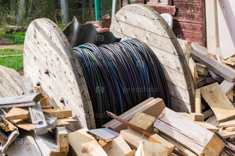 Деревянная катушка электрического кабеля среди деревянных бревен во дворе