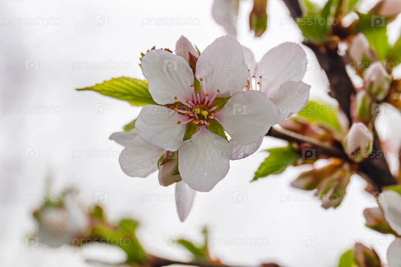 Цветущая войлочная вишня в весеннем саду. Нежные белые цветы. крупным планом