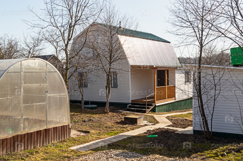 Дачный участок с домом и теплицей из поликарбоната. Весенний пейзаж. Тульская область, Россия