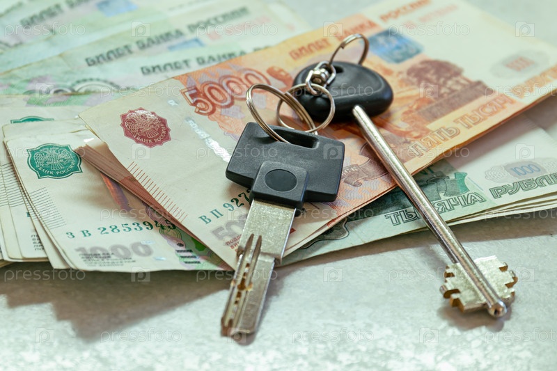 Ключи от квартиры находятся на крупной сумме российских денег. Покупка дома за наличные