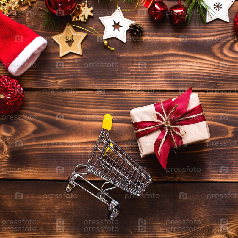 Рождественская квартира лежала на тему покупок, тележки с подарочной коробкой. Покупка подарков к Новому году. Черная пятница, распродажа, декор из звезд, мяч, бусы, гирлянды на деревянном фоне. Место для текста