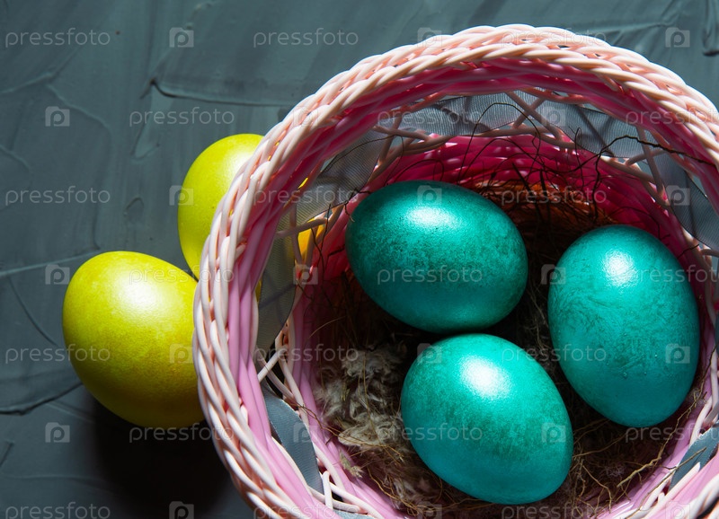 Красочные окрашенные мраморные блестящие пасхальные яйца в корзине с нежными перьями крупным планом. Гнездышко с соломой - пасхальное украшение на стол