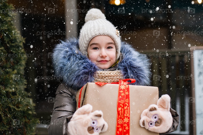 Портрет радостной девушки с подарочной коробкой на Рождество на городской улице зимой со снегом на праздничном рынке с украшениями и огнями. Теплая одежда, вязаная шапка, шарф и мех. Копировать пространство