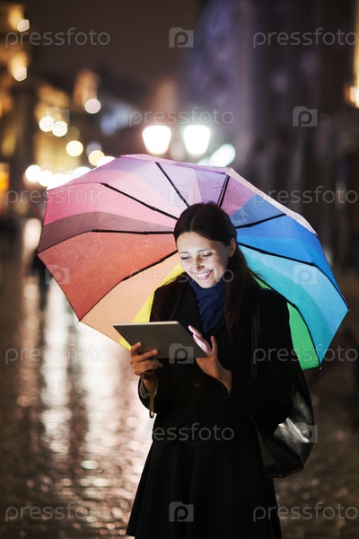 Брюнетка с планшетом на улице в дождливый день