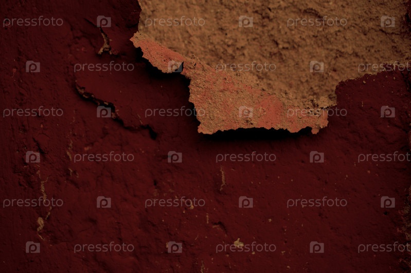 Деталь отслаивающейся штукатурки на темно-красной стене