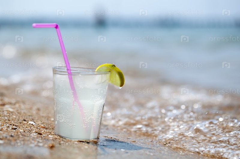 Стакан лимонада или воды на пляже у моря