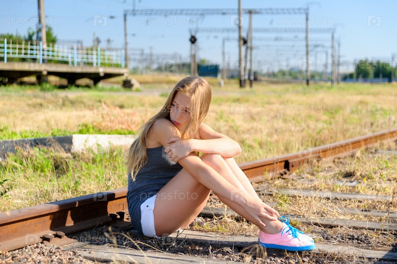 Одинокая и грустная девочка-подросток сидит на ржавом железнодорожном пути в сельской местности. Проблемы подросткового возраста