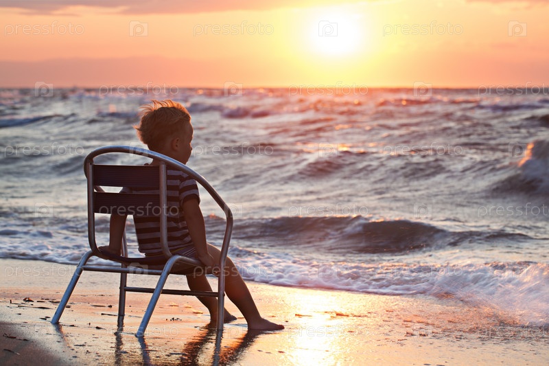 Маленький ребенок смотрит на закат, сидя у моря