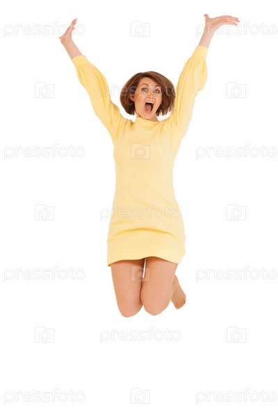 Взрослая женщина в желтом платье прыгает
