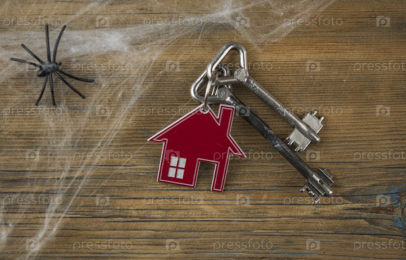 Символ дома с серебряными ключами, паутиной и черными пауками на деревянном столе. Вид сверху