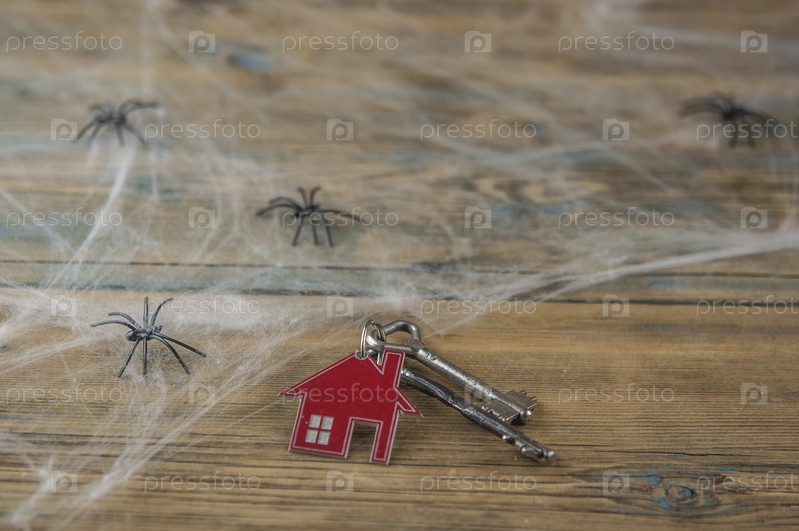 Символ дома с серебряными ключами, паутиной и черными пауками на деревянном столе. Вид сверху