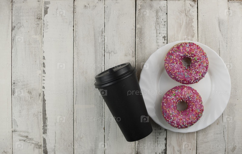 Пончик на тарелке и на деревянном столе. Фото сладостей. Вид сверху. Скопируйте пространство. Макет