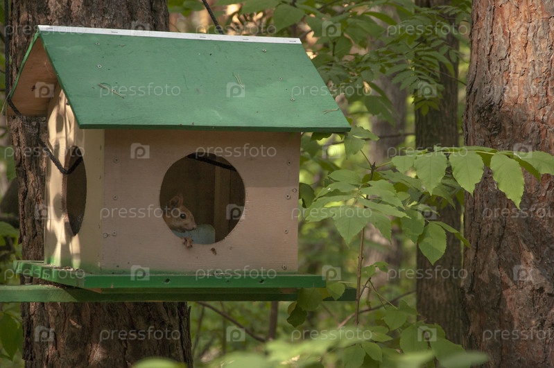 Симпатичная серая белка в кормушке в летнем лесу