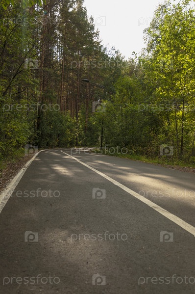 Асфальтовая дорога с разметкой проходит через лес в летний день