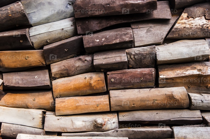 Выветренная стена из кусков бревен, свинченных шурупами