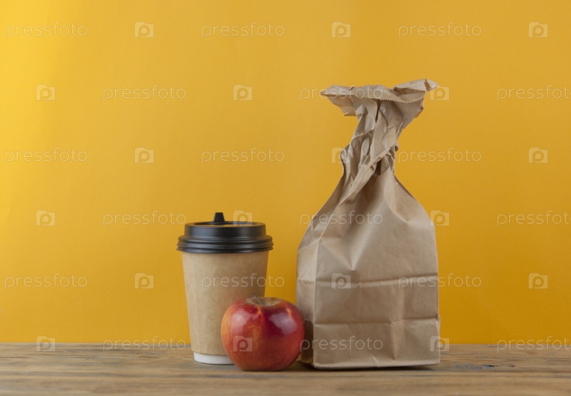 Коричневый бумажный пакет на деревянном фоне
