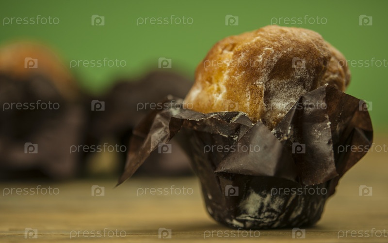 Домашние шоколадно-ванильные кексы на деревянном столе, посыпанные сахарной пудрой