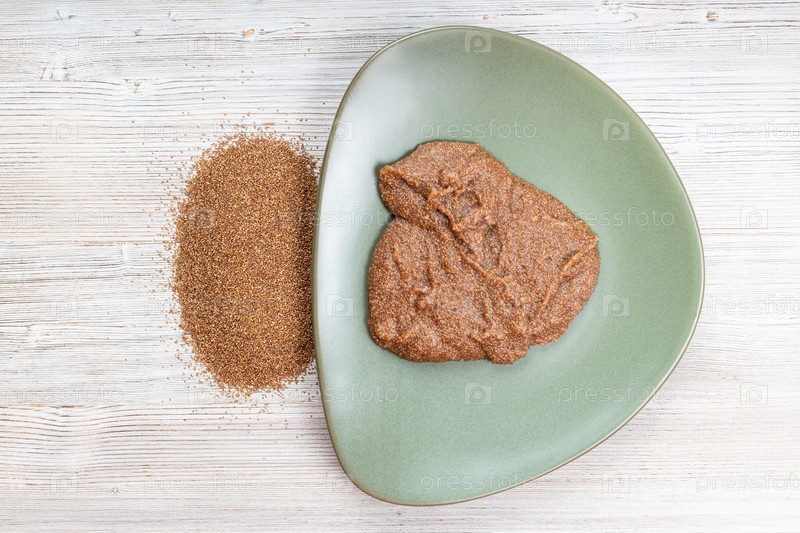 Вид сверху на зерна теффа и вареную кашу
