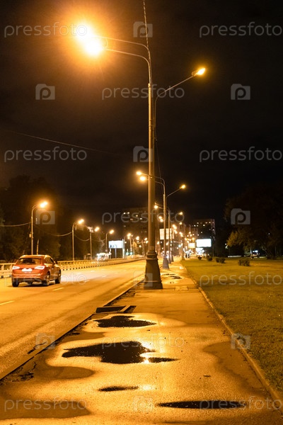 Городской фонарь освещает дорогу после дождя ночью