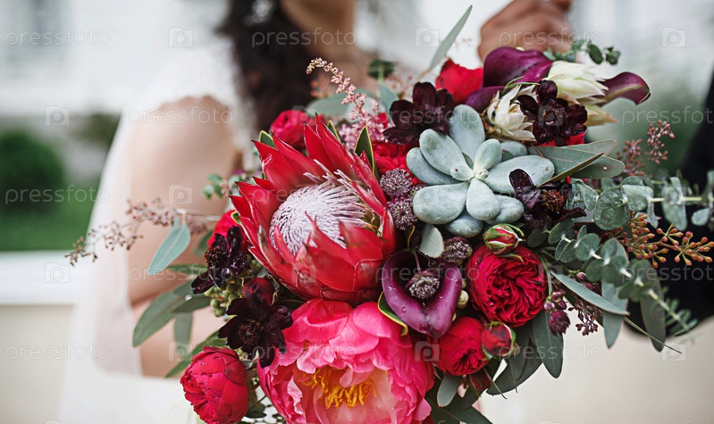 Красный свадебный букет невесты. Флористика, праздничное оформление церемонии живыми цветами. Символ любви, розы в пастельных тонах, суккуленты в декоративных элементах, полевые цветы. Место для текста