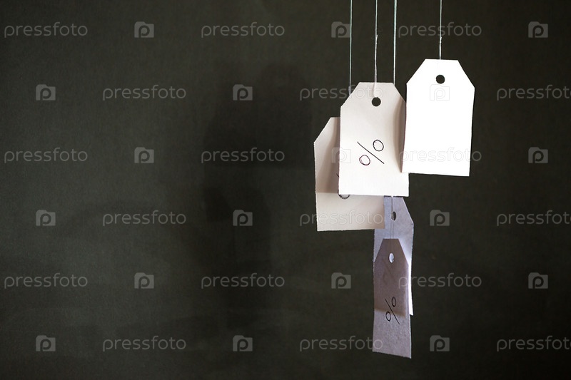 Белые метки со знаком процента висят на ниточках на черном фоне с тенями. Торговля, скидка, продажа, торговое предложение. Скопируйте пространство, макет. Черная пятница