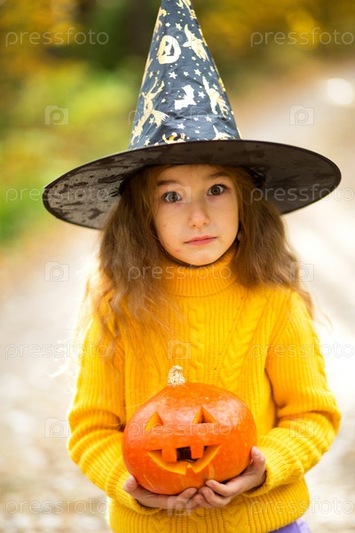 Девушка в шапке ведьмы, в желтом свитере и с тыквой с вырезанными глазами и ртом Джек-фонарь в желтом осеннем лесу. Праздник Хэллоуина