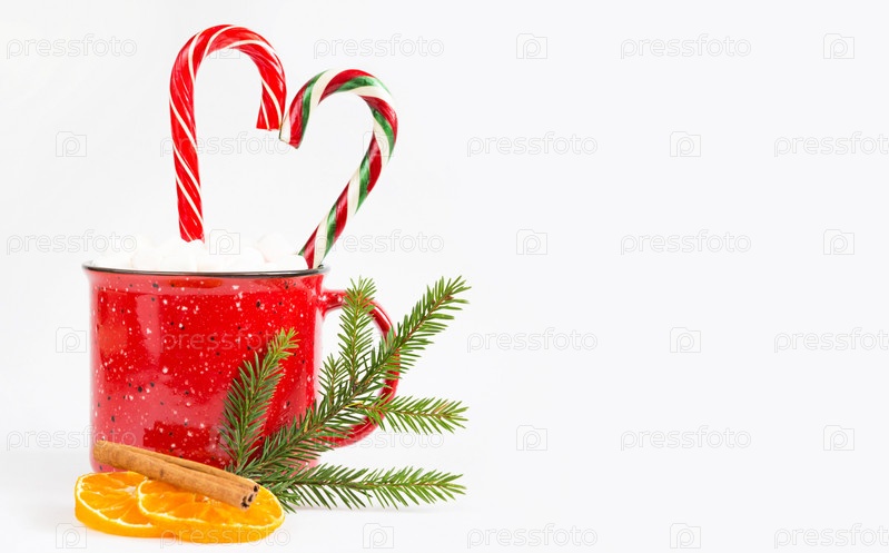 Красная кружка с зефиром и леденцами в форме сердца декорирована натуральной еловой веткой или сушеными дольками апельсина и палочками корицы. Рождество и Новый год, аромат праздника