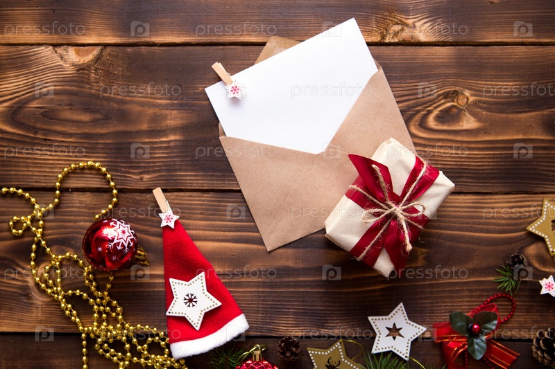 Почтовый конверт из крафт-бумаги с белым листом для текста на деревянном фоне с рождественским декором. Письмо Деду Морозу, список желаний, новогодняя мечта, подарок. Плоская планировка, пространство для копирования