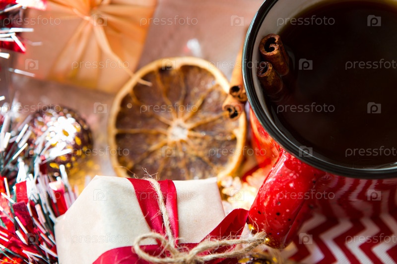 Красная кружка с чаем и палочками корицы, ломтик сушеного апельсина, рождественский декор, подарочные коробки и гирлянды на столе. Плоская укладка. Новый год