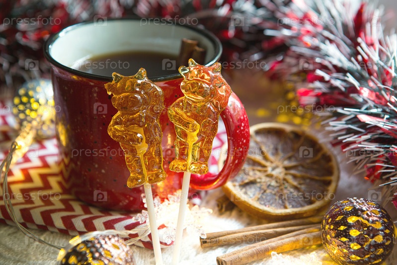 Два леденца на палочке в форме символа нового 2021 года - бык на фоне рождественского декора с красной чашкой чая. Гирлянды, корица и сушеный апельсин - атмосфера тепла, уюта и волшебства
