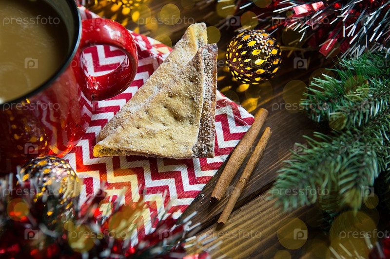 Треугольное печенье с сахарной пудрой и корицей на салфетке с зигзагообразным узором в рождественском декоре. Красная кофейная кружка с зефиром, еловыми ветками, гирляндой, новым годом, комфортом