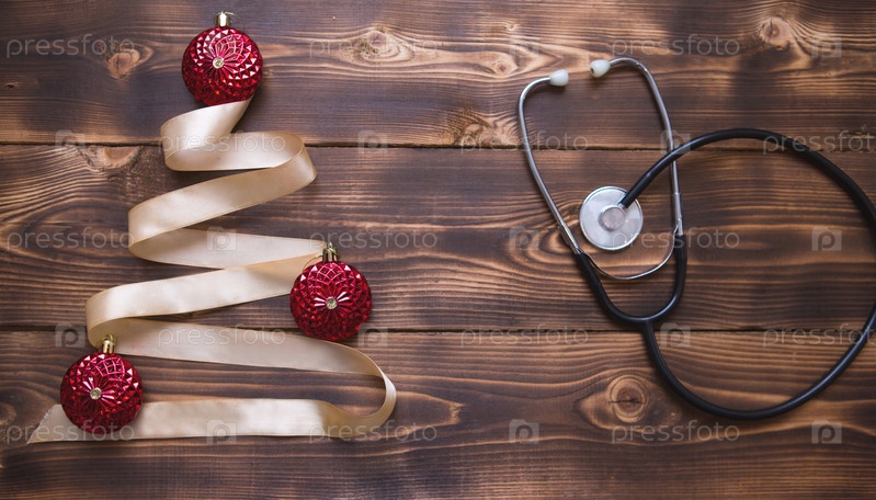 Новогодняя квартира лежала на медицинскую тему. Украшения на новый год из звездочек, шара, ленточек, шапочки Санты и стетоскопа врача. Деревянный фон, место для текста