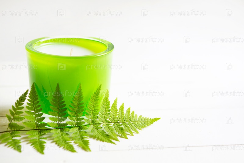 Зеленая ароматическая свеча с папоротником и натуральным ароматом на белом фоне. Ароматерапия, релаксация, уход за телом, гармония. Копировать пространство