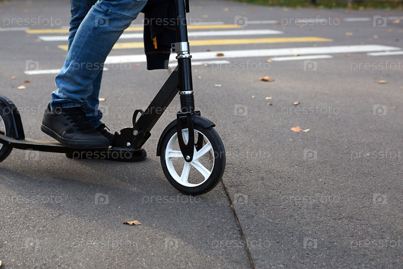 Ноги мужчины в джинсах и кроссовках на скутере в парке осенью с опавшими сухими желтыми листьями на асфальте. Осенние прогулки, активный образ жизни, экологически чистый транспорт, пробки