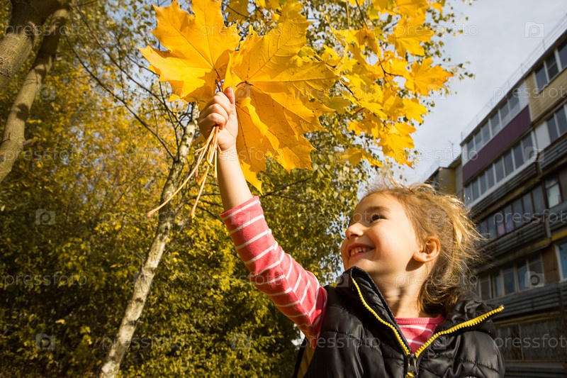 Счастливая маленькая девочка с букетом желтых кленовых листьев в руке смеется и кричит на фоне осеннего дерева и многоэтажного дома. Бабье лето, листопад, снова в школу