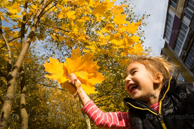 Счастливая маленькая девочка с букетом желтых кленовых листьев в руке смеется и кричит на фоне осеннего дерева и многоэтажного дома. Бабье лето, листопад, снова в школу