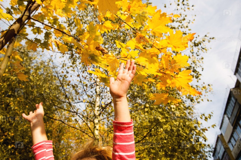 Детские руки радостно подняты вверх на фоне желтого клена и многоквартирного дома. Атмосфера осени, бабьего лета, детского школьного возраста. Место для текста