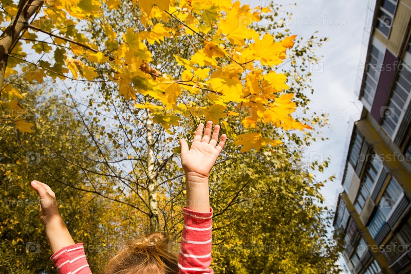 Детские руки радостно подняты вверх на фоне желтого клена и многоквартирного дома. Атмосфера осени, бабьего лета, детского школьного возраста. Место для текста