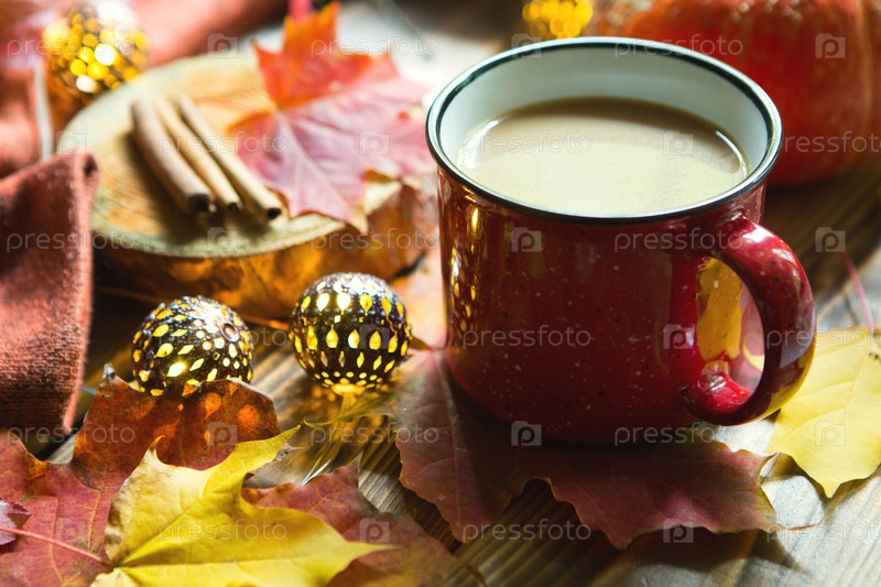 Красная кружка с горячим какао на столе с опавшими кленовыми листьями, круглыми лампами, гирляндами, палочками корицы, теплым одеялом. Осенняя атмосфера, согревающий кофе, женские руки в белом свитере, уют и комфорт