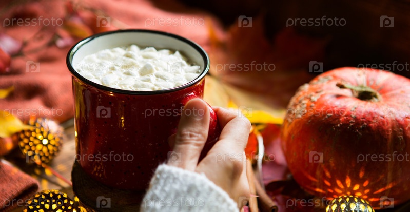 Горячий шоколад из красной кружки с зефиром на столе с кленовыми листьями, гирляндами, палочками корицы. Осенняя атмосфера, согревающий кофе, какао, женские руки в белом свитере, уют и комфорт. Копипространство