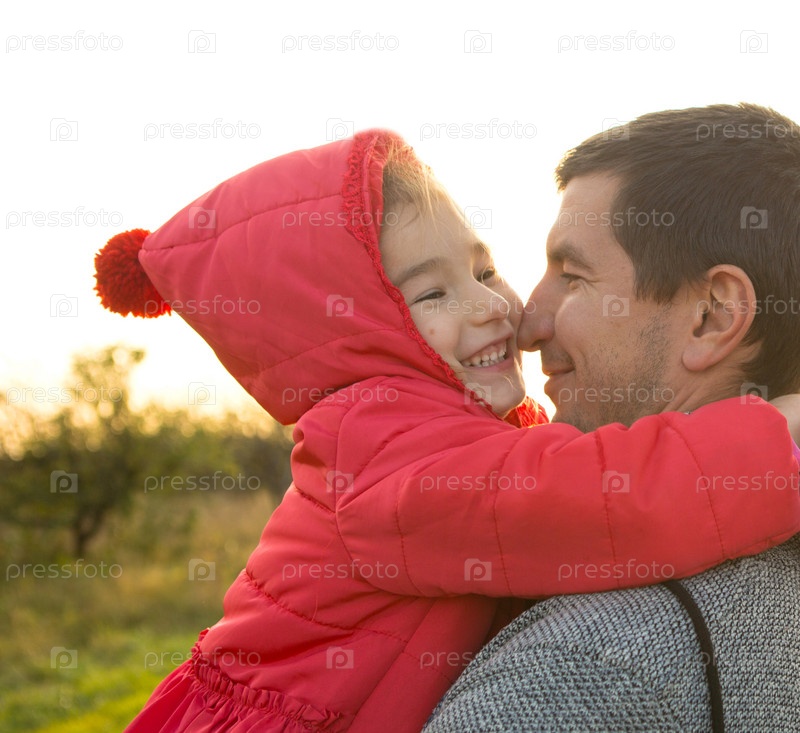 Маленькая девочка в красной куртке с капюшоном обнимает и целует папу, улыбается, трогает нос. Счастливая семья, детские эмоции, день отца, яркие лучи солнца, кавказская внешность. Место для текста