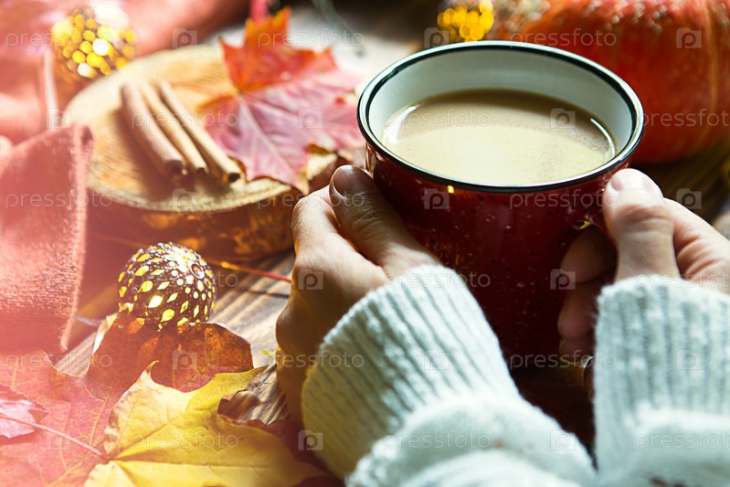 Красная кружка с горячим какао на столе с опавшими кленовыми листьями, круглыми лампами, гирляндами, палочками корицы, теплым одеялом. Осенняя атмосфера, согревающий кофе, женские руки в белом свитере, уют и комфорт
