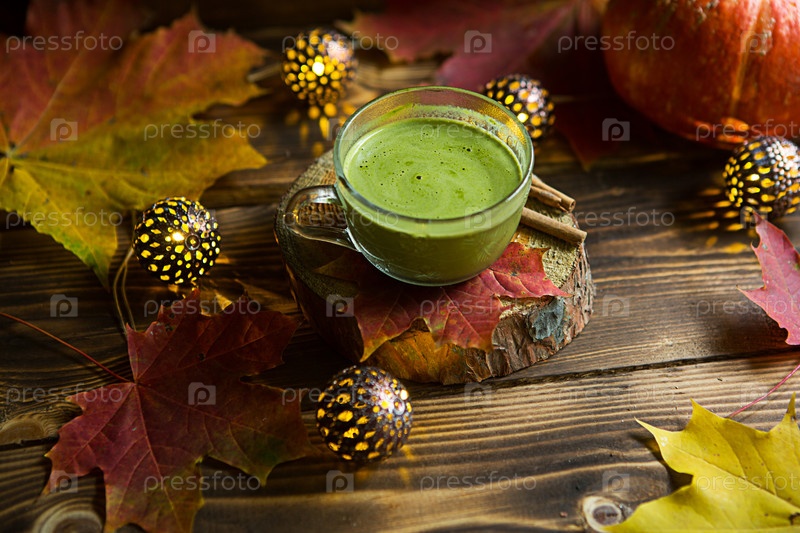 Зеленый японский чай матча с пеной в прозрачной чашке на деревянном столе в осеннем натюрморте. Теплая атмосфера и уют, гирлянды огней, красные кленовые листья, палочки корицы, тыква, печенье, ломтик